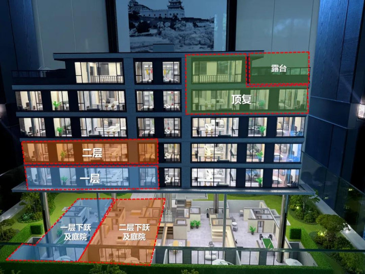 具体到住宅产品,不仅有尺度摄人的四代宅,而且在一层带院子与地下室,顶层带露台的挑空之下,二层还创新做出了带院子和地下室的复式建筑,将原本一个小区中最难去化的楼层,变成了王牌产品。
