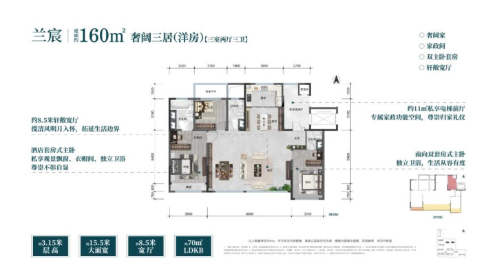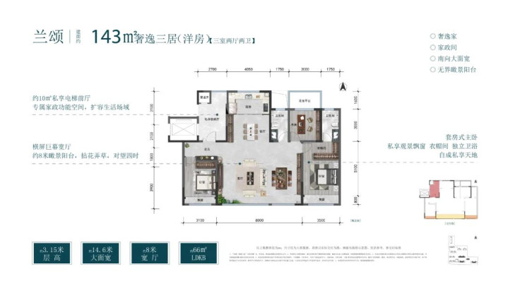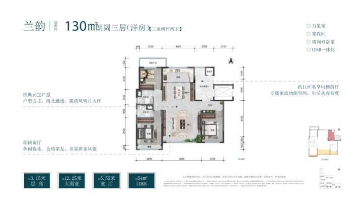 四个主力户型,带上下水的独立电梯厅,全明通透元宝户,在各个面积段都近乎满分且无法迭代,小高层层高做到约3.05米,洋房约3.15米正是市场上改善客群最需要的户型。
